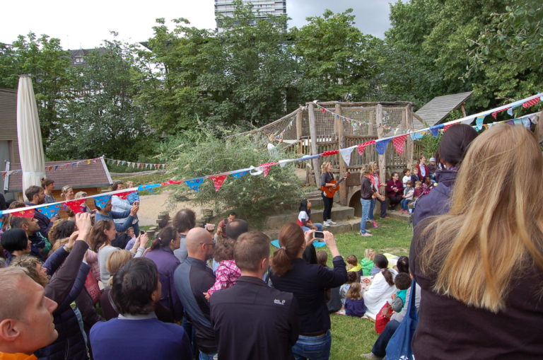Mit dem Lied „Hello to all the children of the world“ stimmte ein vielköpfiger Chor von Kindern aus der Internationalen Kita in das Fest ein, das mit einem internationalen Buffet aufwartete und mit einem bunten Rahmenprogramm die Gäste unterhielt. Zum Programm gehörten eine Internationale Modenschau und Internationale Tänze, wobei die Line-Dance-Gruppe mit Kita-Leiterin Bettina Stock besonderen Applaus erhielt.
