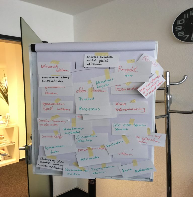 Die jugendlichen Seminarteilnehmer befassten sich vormittags mit verschiedenen Arten von Trickfilmen, stellten Gemeinsamkeiten und Unterschiede von Trickfilmen aus verschiedenen Ländern dar und machten sich erste Gedanken darüber, was für sie interkulturelle Öffnung bedeutet. Gemeinschaft, Zusammenhalt, Verständnis, Respekt und Antirassismus wurden als zentrale Säulen für ein gutes Miteinander erkannt. Weiterhin wurden Ideen dazu erarbeitet, wie thematisch ein Baustein der interkulturellen Öffnung in einem selbst gedrehten und gestalteten Trickfilm dargestellt werden könnte.